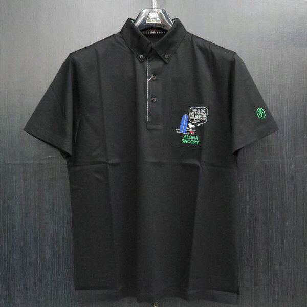 スヌーピーのワンポイント刺繍と背中にプリントが入った天竺素材の半袖ボタンダウンポロシャツです。