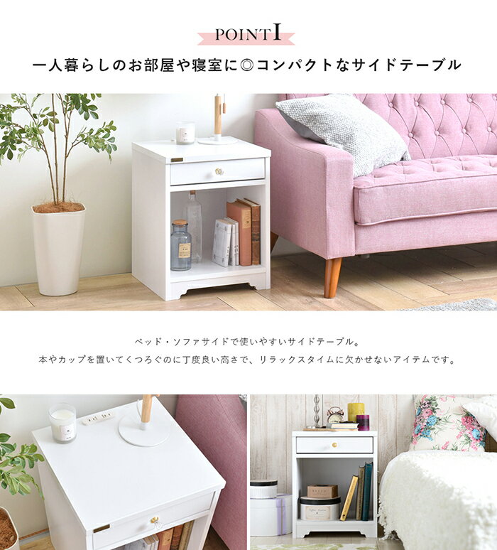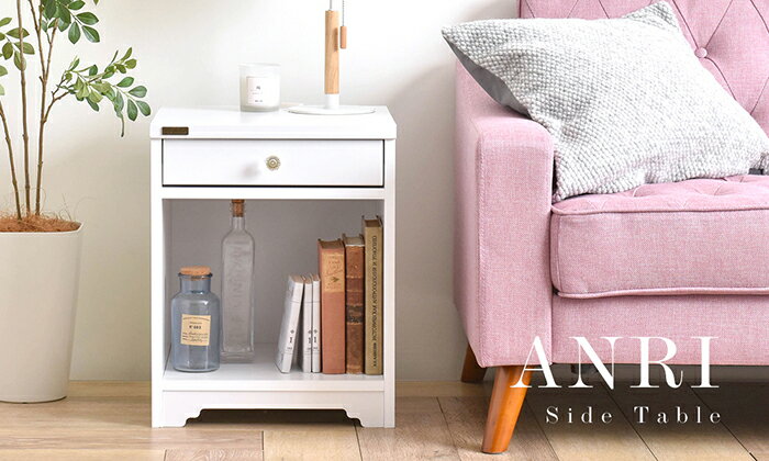 送料無料 サイドテーブル ナイトテーブル 幅40cm 引き出し コンセント付き ベッドサイドテーブル ソファーサイド ANRI アンリ 木製 姫系 白家具 かわいい おしゃれ フレンチカントリー アンティーク コンパクト 北欧 一人暮らし フェミニン ホワイト